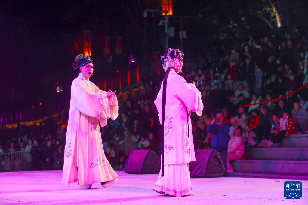 2025年12月19日,江苏省苏州昆剧院演员在重庆市黔江区武陵水岸表演昆曲《牡丹亭·惊梦》。新华社发(杨敏摄)