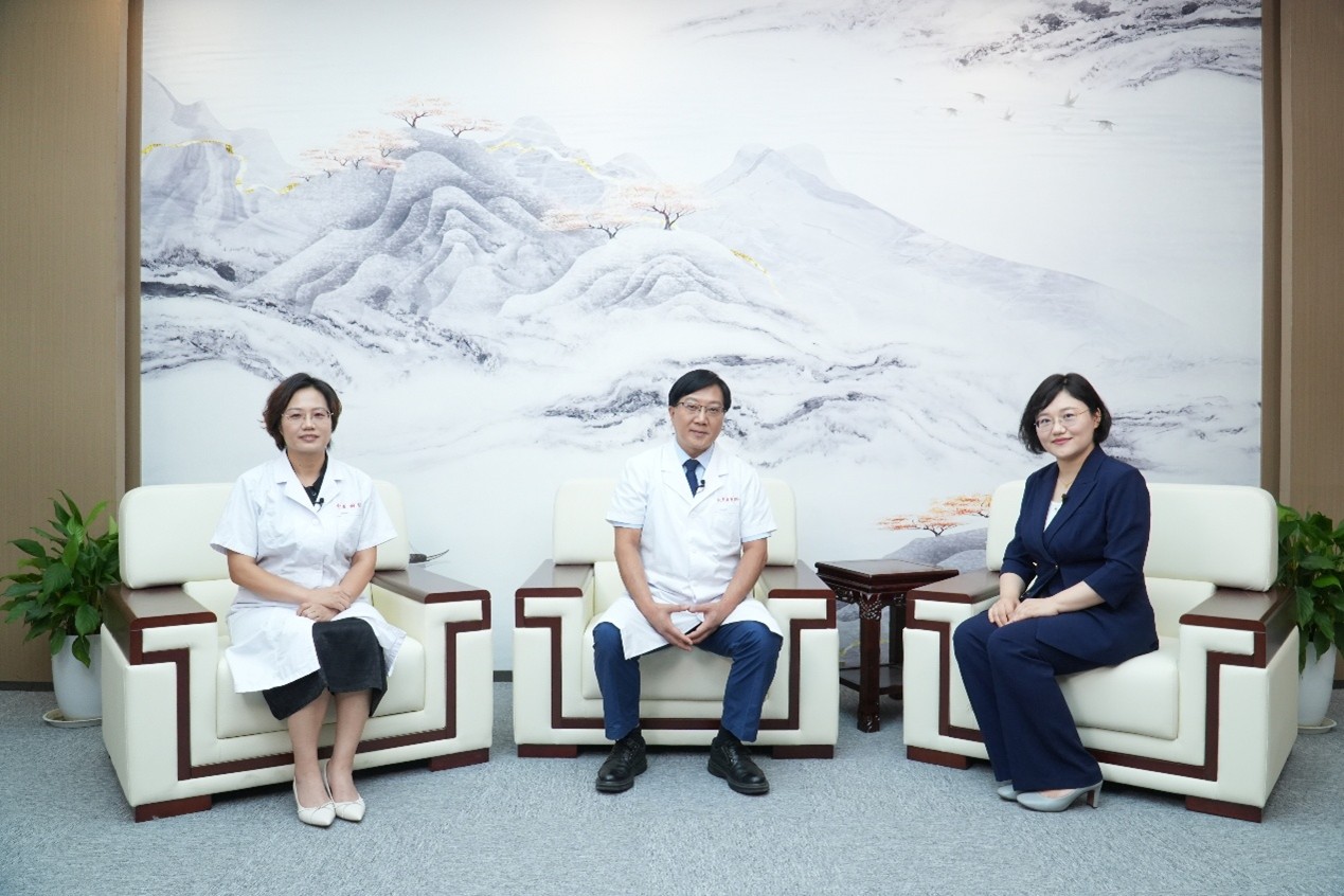 山东中医药大学附属医院党委副书记、院长邓华亮(中),以及内分泌科主任黄延芹(左)接受新华网采访。