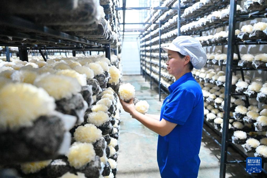 宁德晟农农业开发有限公司员工在生产车间查看银耳长势(2025年7月23日摄)。新华社记者林善传摄